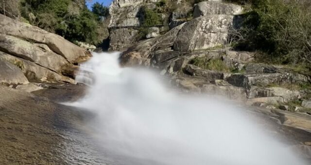 La rapidez de las aguas del río Umia forman una cascada de más de 30m de caída en la que las pozas, los rápidos y los toboganes naturales sobre los bolos gra...